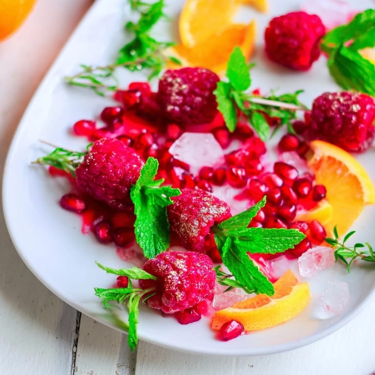 Fresh pomegranate seeds, orange and lemon slices, raspberries, and optional red currants bring vibrant color and balanced flavors.