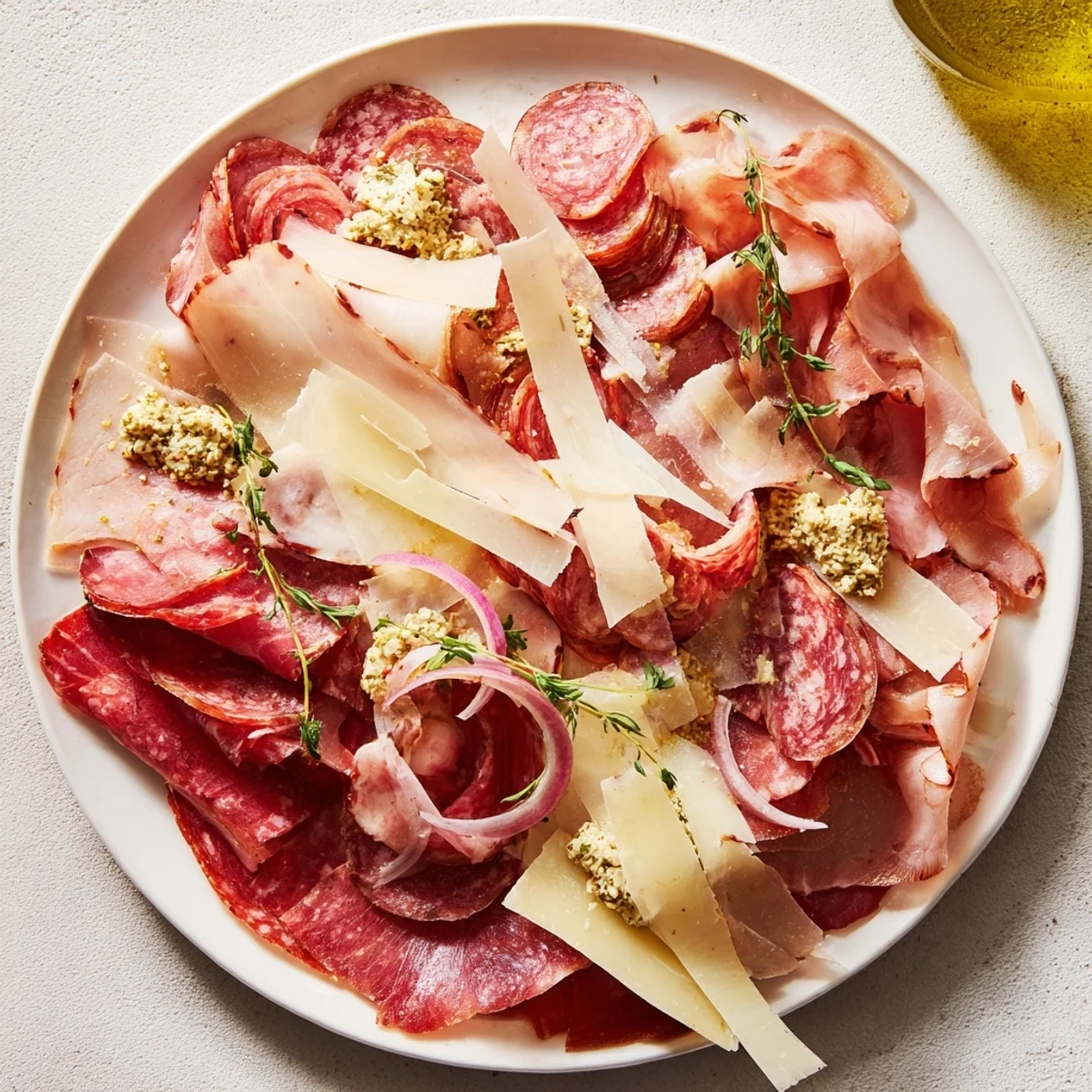 Save to Pinterest There's something about pulling together a charcuterie board that feels less like cooking and more like creating a small edible landscape. I discovered this particular arrangement one evening when a friend arrived unexpectedly, and I had just enough good meats and aged cheeses in my kitchen to improvise something special. The contrast between the rough, bold slices of smoked beef and the delicate, nearly translucent shavings of Parmigiano Reggiano became the whole point—it's a platter that celebrates what happens when you honor both the rustic and the refined.
