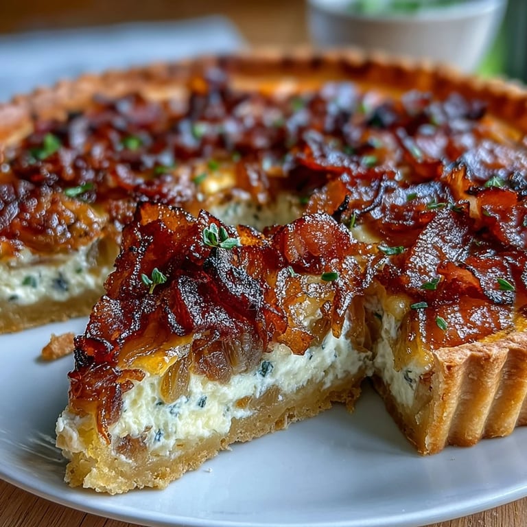 The secret to this quiche's depth of flavor lies in the slow caramelization of the onions with a touch of sugar and thyme, which creates a sweet base that perfectly complements the smoky, crisp bacon bits scattered throughout the tart.