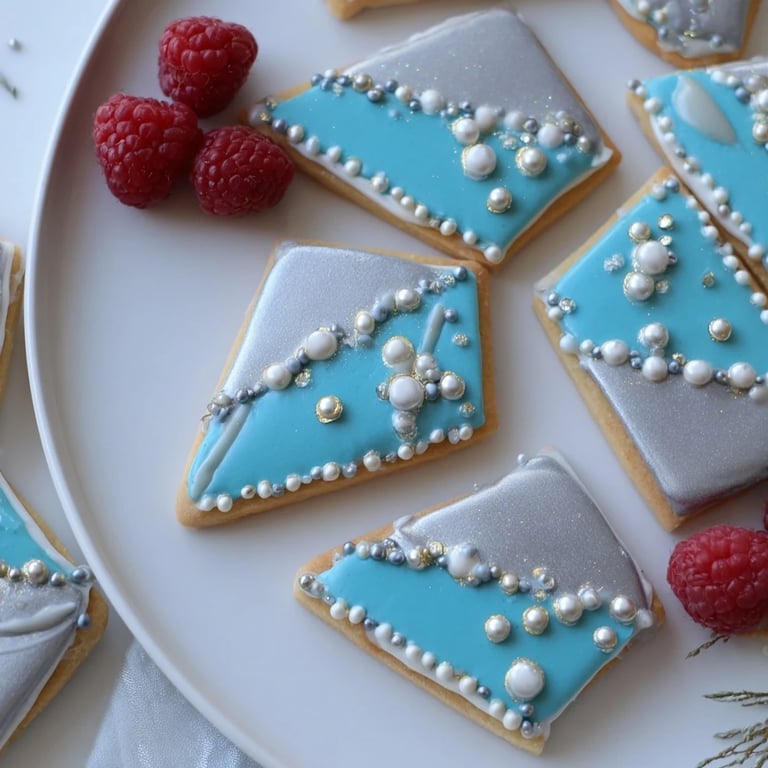 - a. Mix powdered sugar, milk, corn syrup, and extract to create a smooth, thick icing. b. Divide into bowls and tint with desired gel colors. c. Pipe outlines and flood cookies with icing. While wet, embellish with dragées, edible pearls, or gold leaf for a gem-like effect. Let dry.