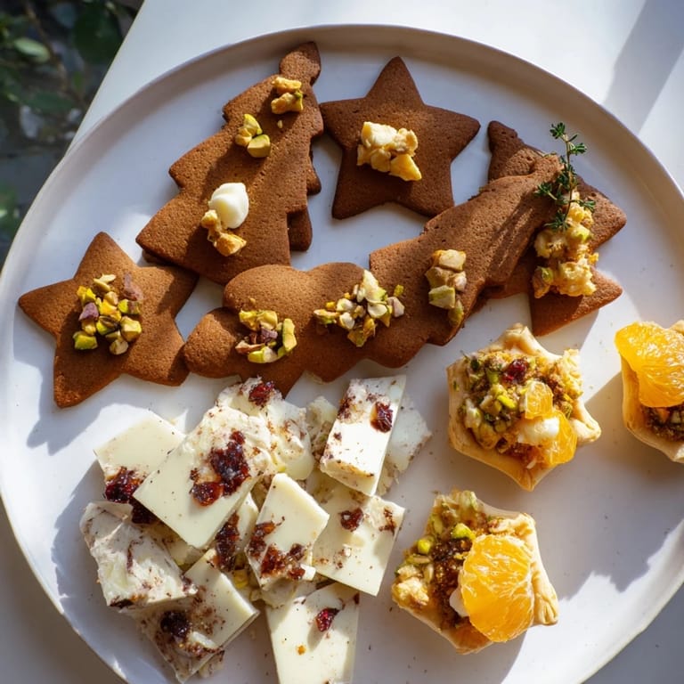 Save to Pinterest Celebrate the holiday season with the Festive Christmas Joy Trios, a charming collection of sweet and savory bites that bring warmth and cheer to your gatherings. This delightful assortment combines spiced gingerbread mini cookies, vibrant cranberry pistachio white chocolate bark, and rich mini Brie and fig tartlets—perfect for sharing festive flavors and creating joyful memories at your Christmas table.