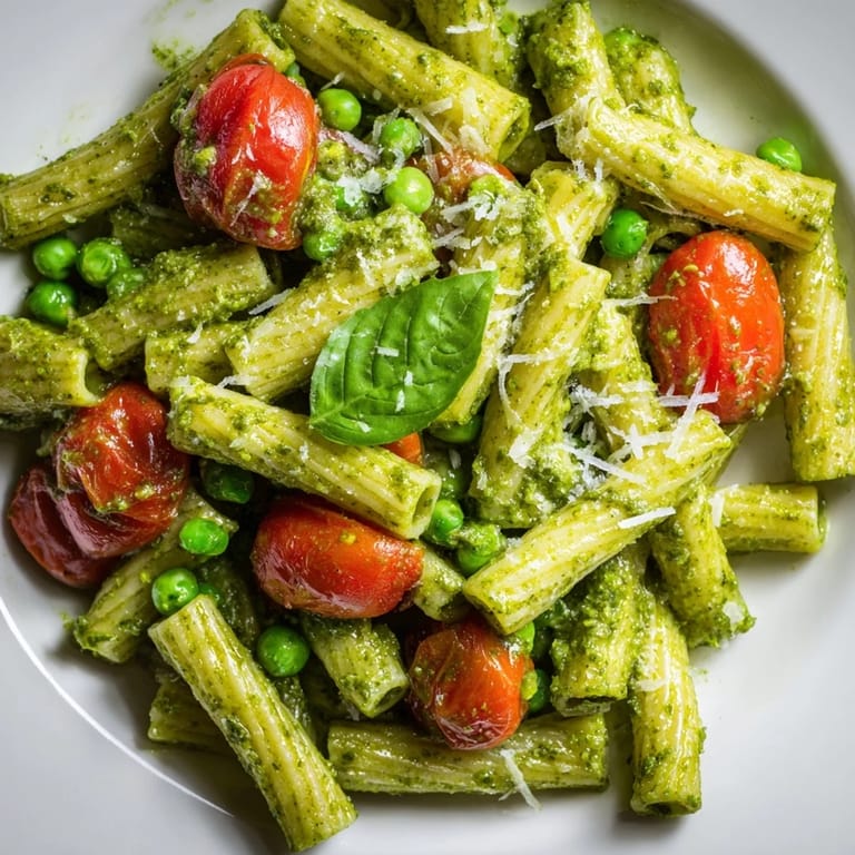 Save to Pinterest My neighbor showed up at my door one Saturday with a huge bowl of this, still cool from her fridge, and I ate half of it standing in my kitchen before even saying thank you. The pesto clung to every twist of pasta, the tomatoes burst with juice, and the peas added this unexpected sweetness that made me forget I was eating something so simple. She laughed when I asked for the recipe, saying it was just what she threw together when her basil plant went wild. That bowl changed how I thought about pasta salad forever.