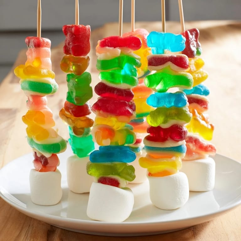 Save to Pinterest Colorful and whimsical kabobs loaded with an assortment of gummy candies, perfect for parties or special occasions. These sweet skewers are a playful, crowd-pleasing treat for kids and adults alike.