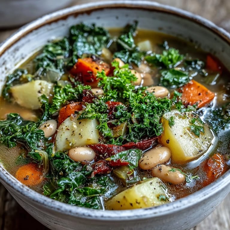 Save to Pinterest My neighbor knocked on the door one gray afternoon with a bunch of kale from her garden, apologizing for the abundance. I had no grand plan, just a half-full vegetable drawer and the desire to do something nourishing with what I had. This soup emerged from that spontaneous moment, and it's become the dish I make whenever I need to feel grounded again. There's something about the way the kale softens into the broth, releasing its earthy promise, that feels like a quiet gift to yourself.