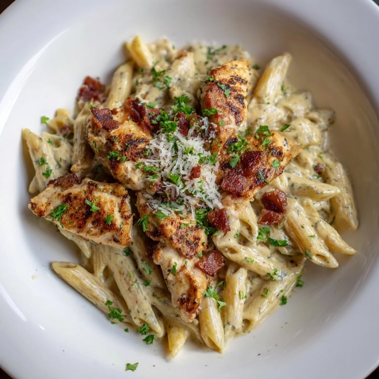 Save to Pinterest A creamy flavorful pasta dish featuring tender chicken crispy bacon and a homemade ranchinfused sauce tossed with penne. Perfect for a comforting weeknight dinner.
