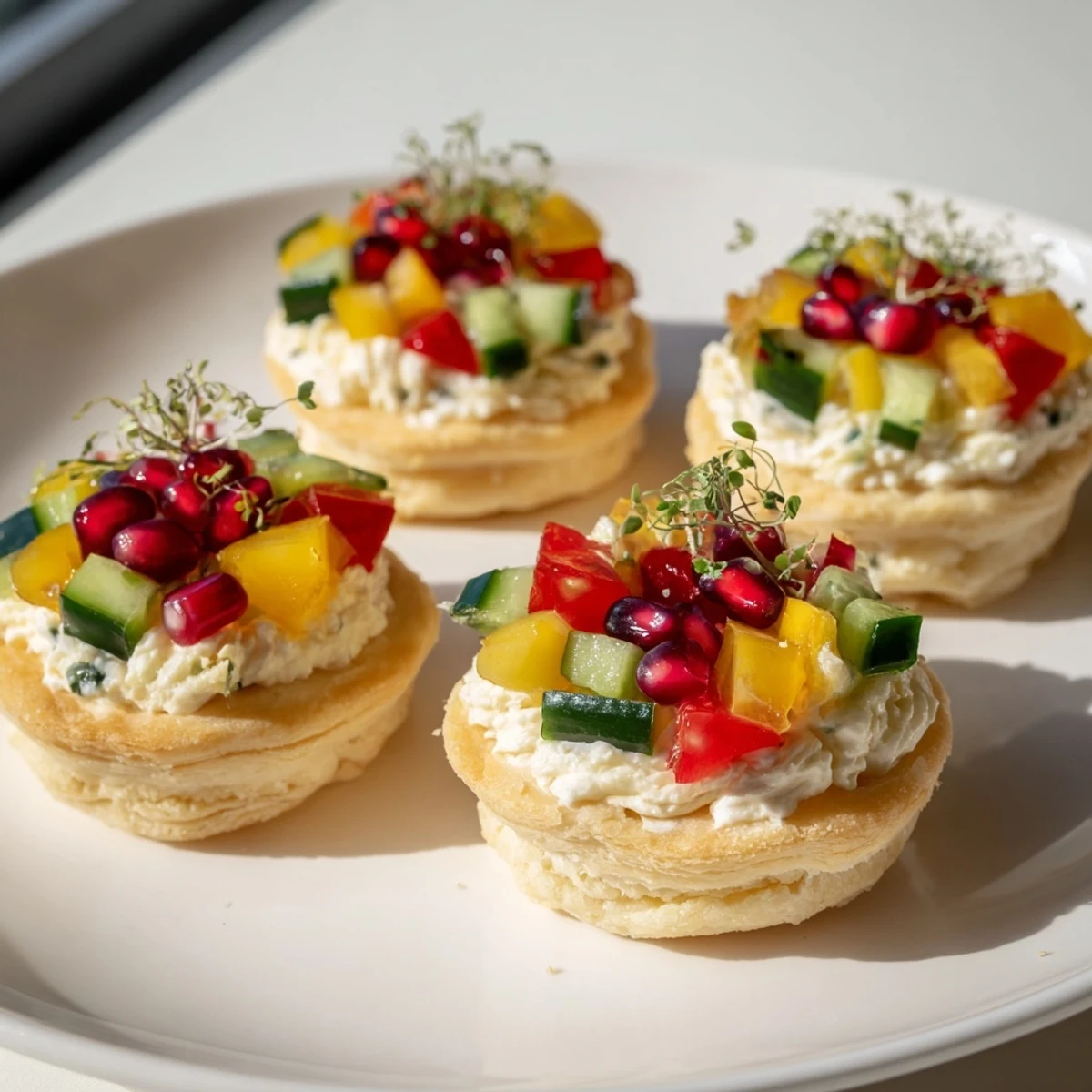 - 7. Decorate each tartlet with diced peppers, tomatoes, cucumber, pomegranate seeds, and microgreens or dill to resemble a festive wreath.