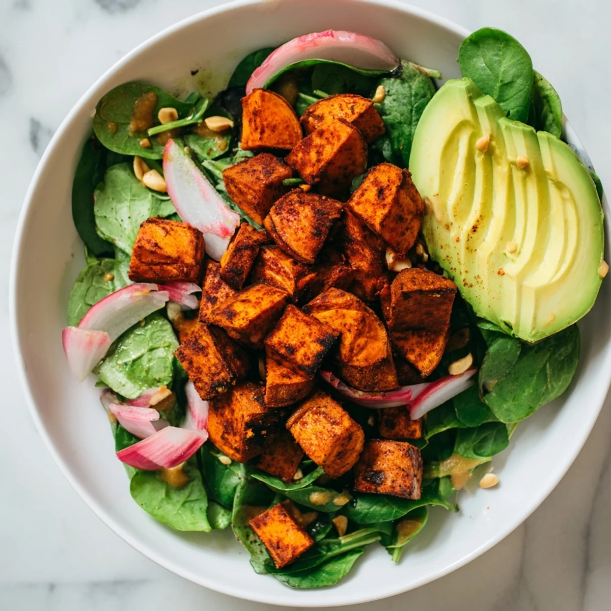 Save to Pinterest A vibrant nourishing salad bowl featuring roasted spiced sweet potatoes crisp radicchio creamy avocado and a zesty peanut dressing—perfect for a satisfying lunch or light dinner.