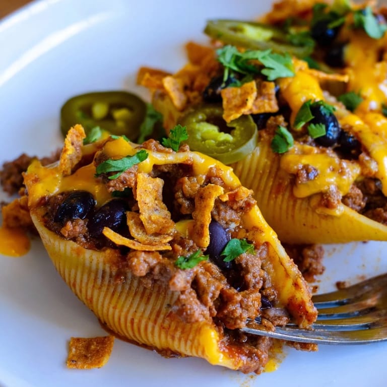Save to Pinterest A bold fusion of Italian comfort and Tex-Mex flavor: jumbo pasta shells loaded with spiced beef and black beans, drenched in nacho cheese sauce, and finished with crushed Doritos for a crunchy, indulgent twist.
