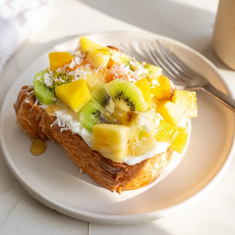 Save to Pinterest A vibrant, creamy take on the viral custard toast, featuring coconut yogurt and a medley of fresh tropical fruits. The perfect balance of crisp, creamy, and fruity goodness for breakfast or brunch.
