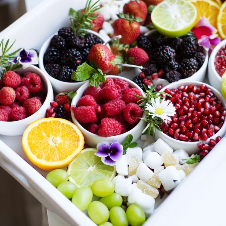 - Fresh Fruits: 1 cup fresh raspberries, 1 cup fresh blackberries, 1 cup fresh strawberries hulled and halved, 1 cup pomegranate arils, 2 lemons thinly sliced into rounds, 2 limes thinly sliced into rounds, 1 orange thinly sliced into half-moons, 1 cup seedless green grapes halved