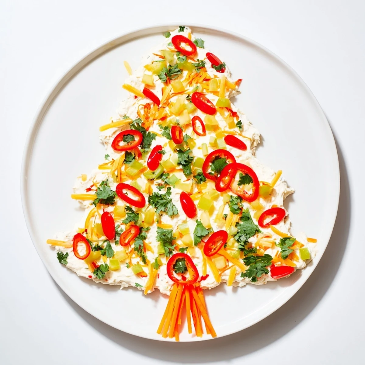 Save to Pinterest A festive, spicy dip shaped like a Christmas tree, featuring creamy cheese, fresh herbs, and a kick of chili peppers—perfect for holiday gatherings.